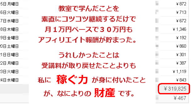 アフィリエイト教室の卒業生の方から、 うれしいお知らせが届きました。 どこにでもいるパソコン素人の方ですが、 教室で学ばれたことを、素直に実践し、コツコツと継続され、 毎月1万円以上の結果に繋がっているようです。 そして … 続きを読む
